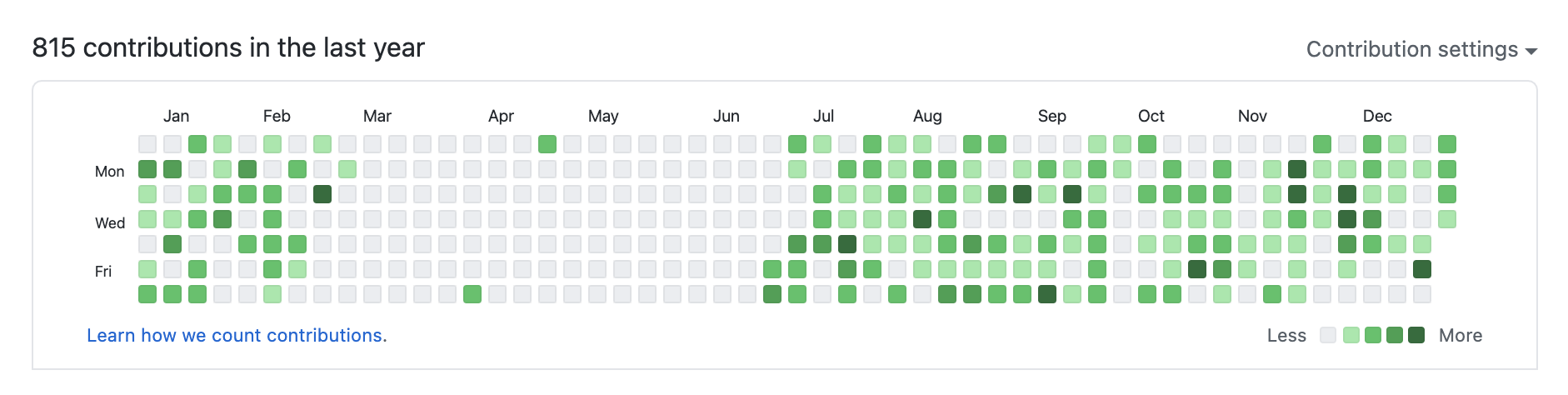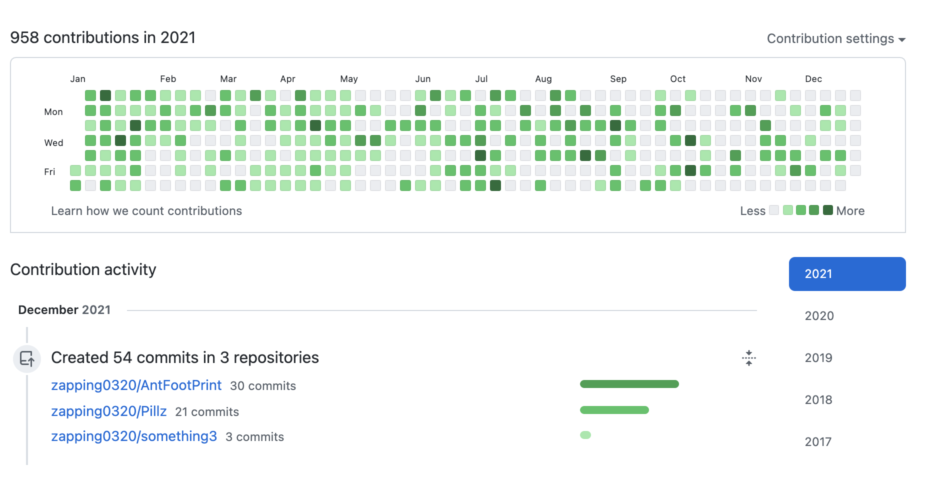 - 당연히 지난 기간에 비해서 커밋수는 많을수 밖에 없는데 ios 관련 코드의 비율을 많이 끌어올린 점. 신규 런칭한 앱에 대한 기록이 반영되어 있다는 점(약먹자)에서 20년보다 나아졌다고 할수 있겠다.(21.12.27 10.00 기준, 작년은 804회)